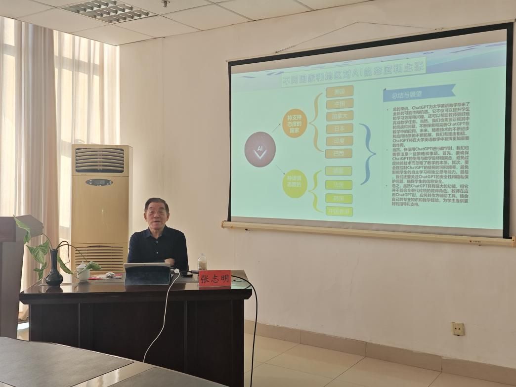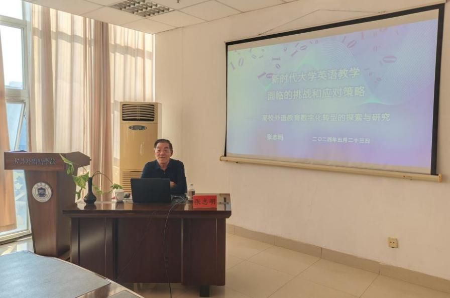 紧接着张志明教授带来题为“新时代大学英语教学面临的挑战和应对策略——高校外语教育数字化转型的探索与研究”的学术演讲。