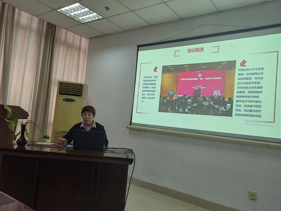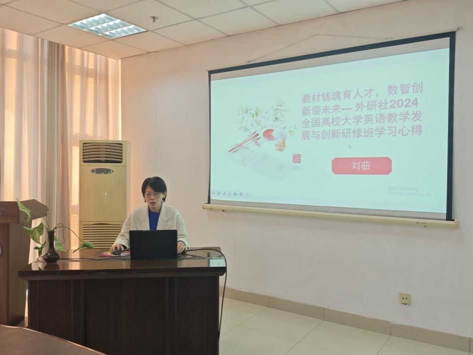 研讨会第二部分,由王莹、刘茹、徐岩和喻兰4位本年度参加外研社“全国高等公司大学英语教学发展与创新研修班”的教师做暑期培训汇报。