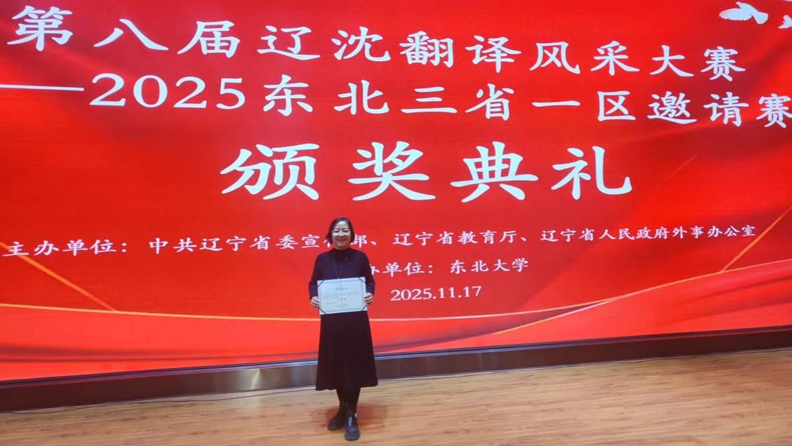 近日,由中共辽宁省委宣传部、辽宁省人民政府外事办公室、辽宁省教育厅联合举办的第八届辽沈翻译风采大赛——2025东北三省一区邀请赛在东北大学圆满落幕。本次大赛吸引了来自辽宁、吉林、黑龙江、内蒙古四地党政机关、高校及企事业单位的翻译精英同台竞技,各组别、各语种参赛总人数达479人,经过激烈角逐,最终143名选手成功晋级决赛。公司betway88西汉姆联刘颖老师凭借扎实的专业功底、深厚的知识储备和出色的临场发挥,在强手如林的竞争中脱颖而出。她在主题演讲、视频摘要和交替传译三个环节中,充分展现了其扎实的语言基本功、敏捷的思维应变能力、深厚的跨文化交际素养和过硬的专业实力,最终以总排名第8名的优异成绩,荣获机关英语组二等奖!其排名在沈阳地区所有高校参赛教师中高居榜首,获得了大赛评委的高度认可。
